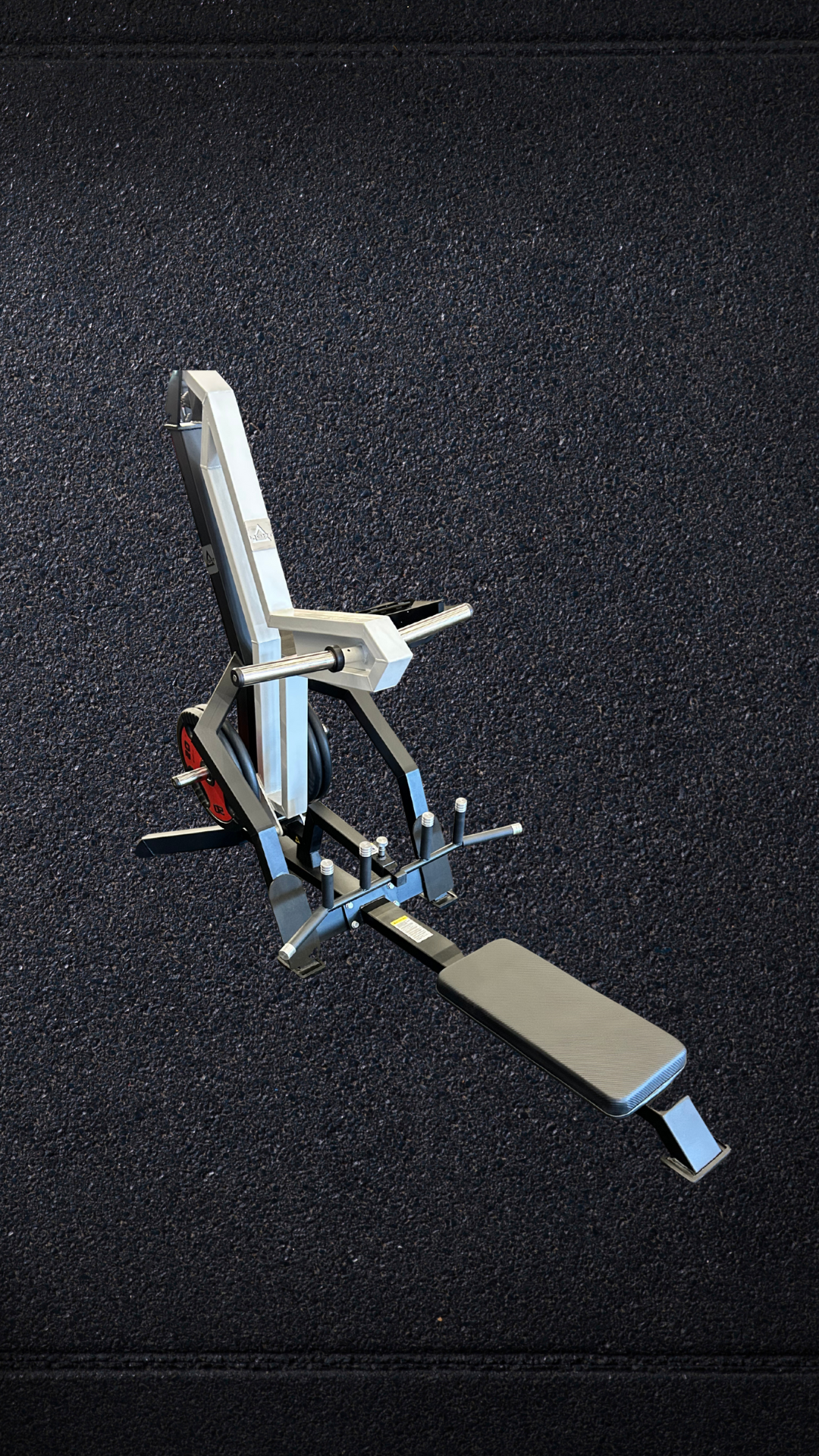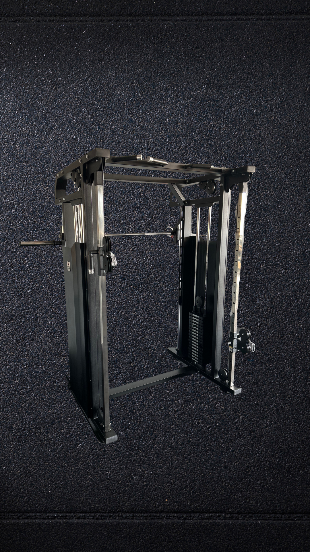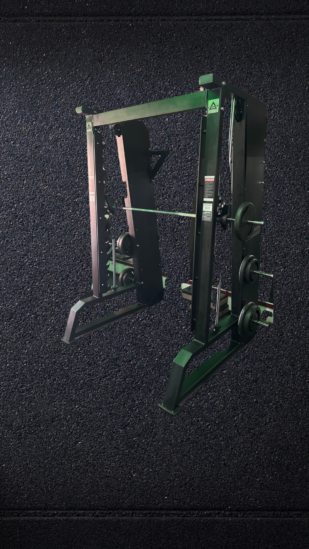 Máquina guiada para exercícios de agachamento, supino e outros movimentos de empurrar. Ideal para treinos com controle de postura.