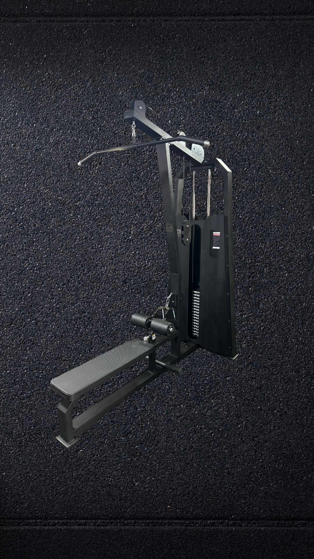 Máquina para trabalhar musculatura das costas com movimento guiado, permitindo exercícios controlados e articulação natural.